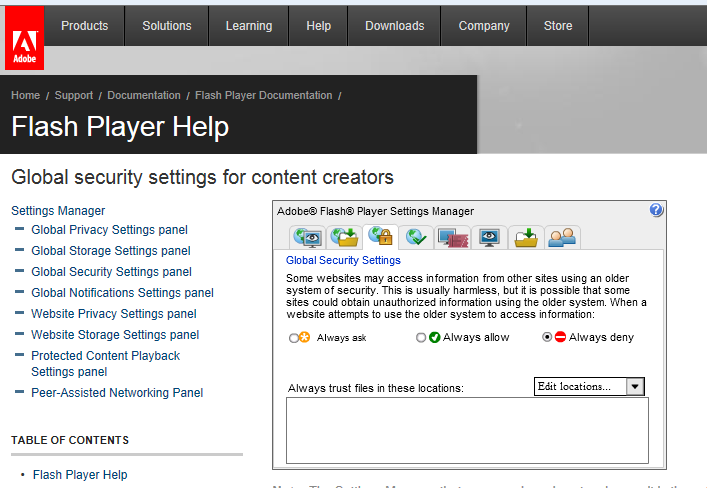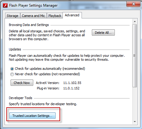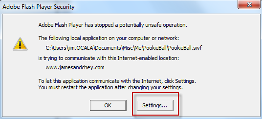 You want to test your flash application from within the IDE. You press CTRL-Enter and all is well. You now want to test in DEBUG mode, so you press CTRL-Shift-Enter, and as soon as your application tries to access the internet, let’s say to run a PHP file, you get an Adobe Flash Player Security Dialog Box telling you that you have to click Settings. Huh? Can they be more descriptive please?