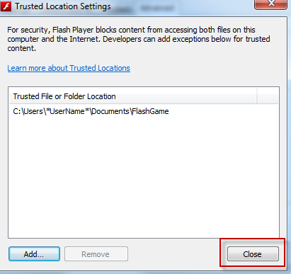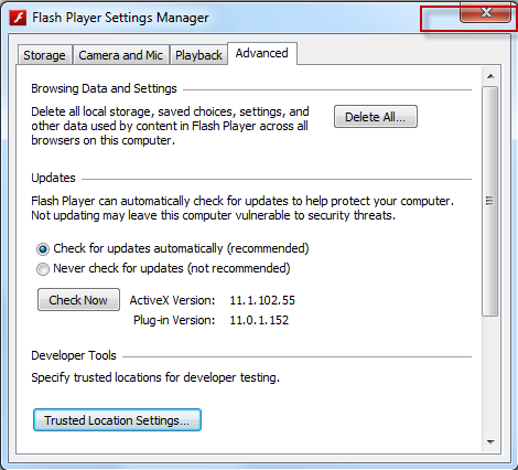 7) Close the Flash Player Settings Manager dialog box by clicking the white X in the red box (top right)