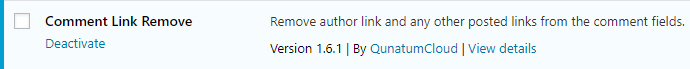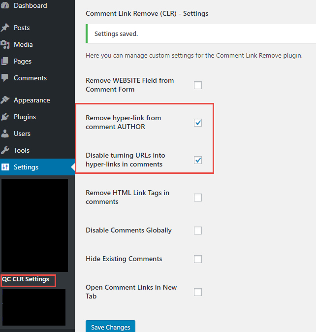 4) Edit the options of the Comment Link Remove settings by checking the checkboxes for “Remove hyper-link from comment AUTHOR”, and “Disable turning URLs into hyper-links in comments”