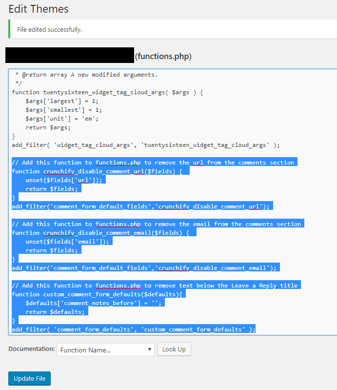 2) Edit the function.php file in your File editor and add the three functions to the bottom of the php file shown in the image below: